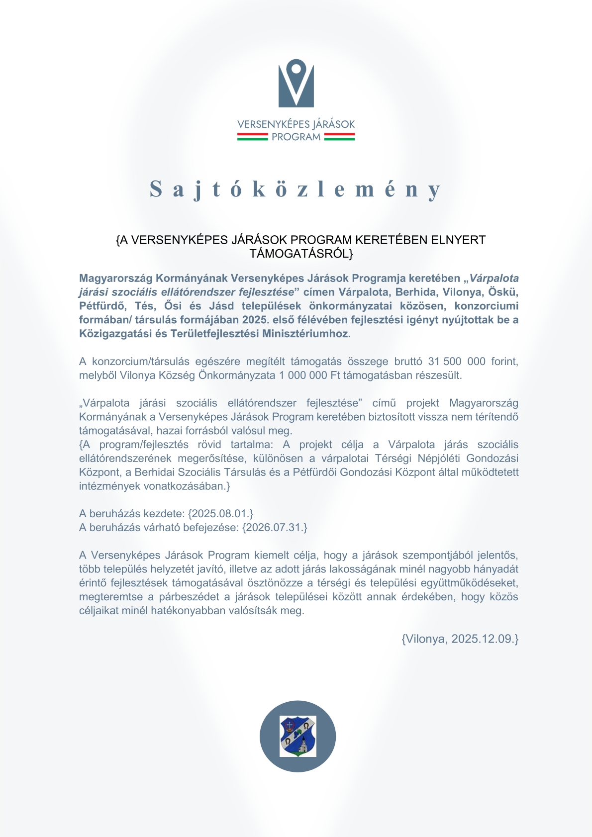 Sajtóközlemény a Versenyképes Járások Program keretében "Várpalotai járási szociális ellátórendszer fejlesztése" címen elnyert támogatásról